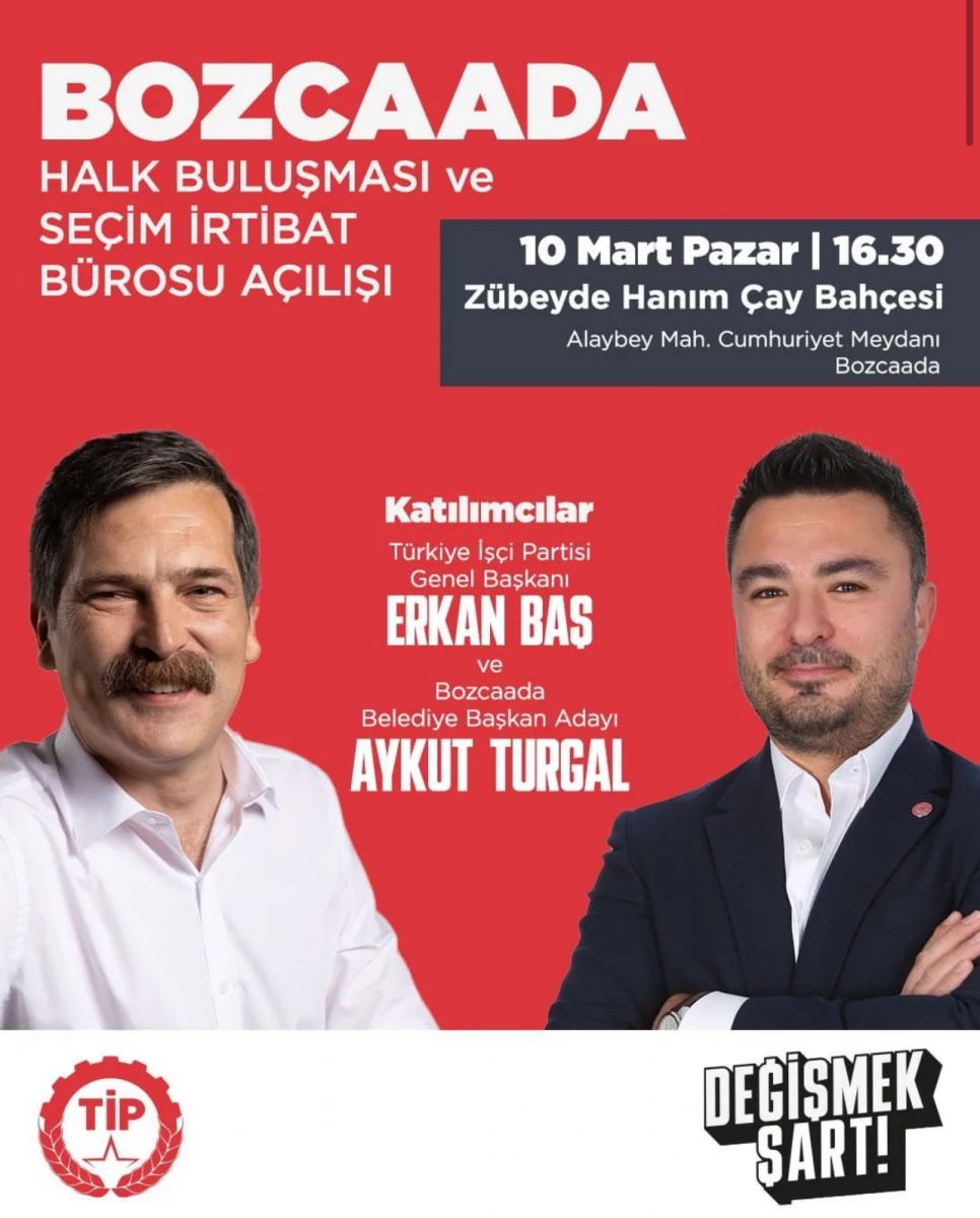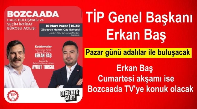 Türkiye işçi Partisi Genel Başkanı Erkan Baş 10 Mart Pazar günü saat 16.30'da Bozcaadalılar ile buluşacak. Zübeyde Hanım Park Kahvesi'nde gerçekleşecek buluşmanın ardından TİP seçim ofisi açılışını gerçekleştirecek.